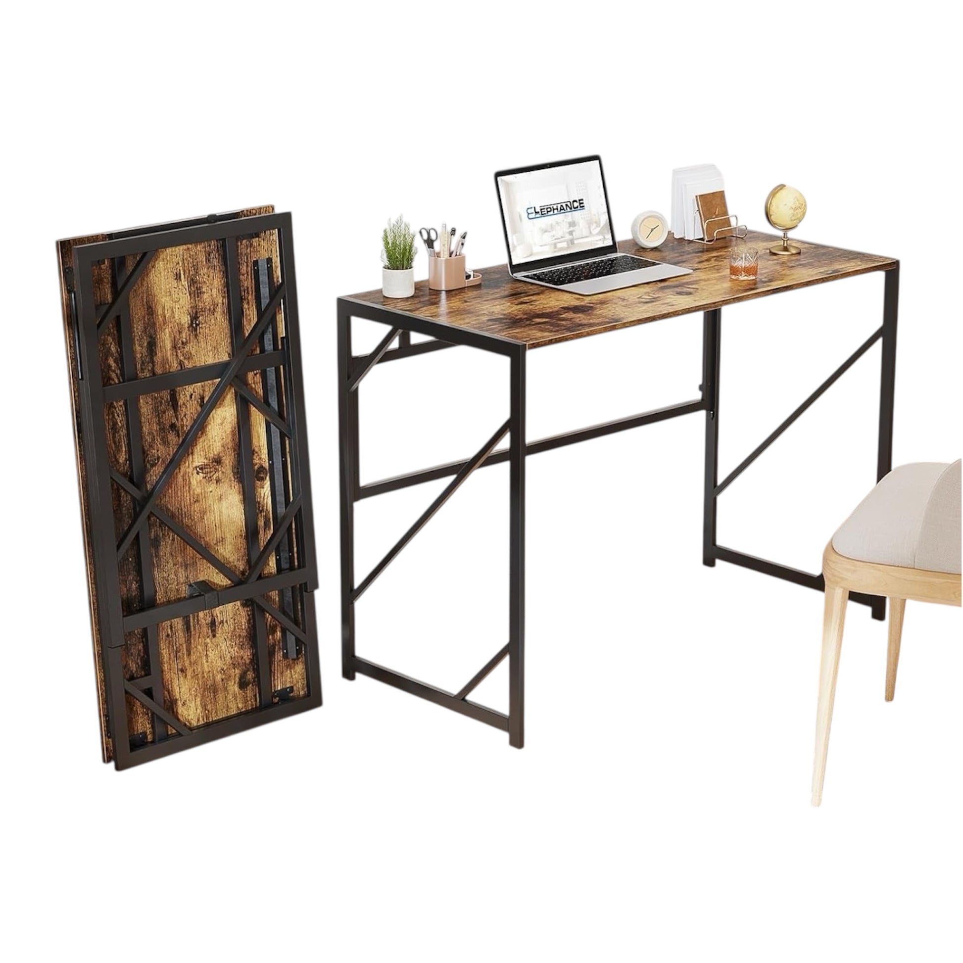Päivitä työtilasi THE FOLDABLE -kokoontaitettavalla työpöydällä, tyylikkäällä rustiikkisen ruskealla, kestävyyttä, kätevyyttä ja monipuolisuutta yhdistävällä työpöydällä. Täydellinen kotitoimistoihin, makuuhuoneisiin tai jopa ulkokäyttöön, tämä työpöytä ei vaadi kokoamista – avaa vain ja aloita työskentely.